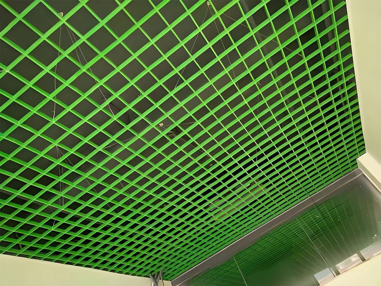 Moderner offener Alu-Metallgitterdecke, perforiertes Design, hochwertiges Aluminium-Metallmaterial (spezieller Lackierprozess, eleganter und imposanter). Die perforierte Struktur bietet dem Raum eine spezifische Schicht an Licht und Schatten, kombiniert lüftungs- und ästhetische Effekte. Aus leichten Glas- und Aluminiumlegierungen gefertigt, ist sie robust, kippfest, feuer- und feuchtigkeitssicher und sehr geeignet für Gewerberäume, Büros etc.